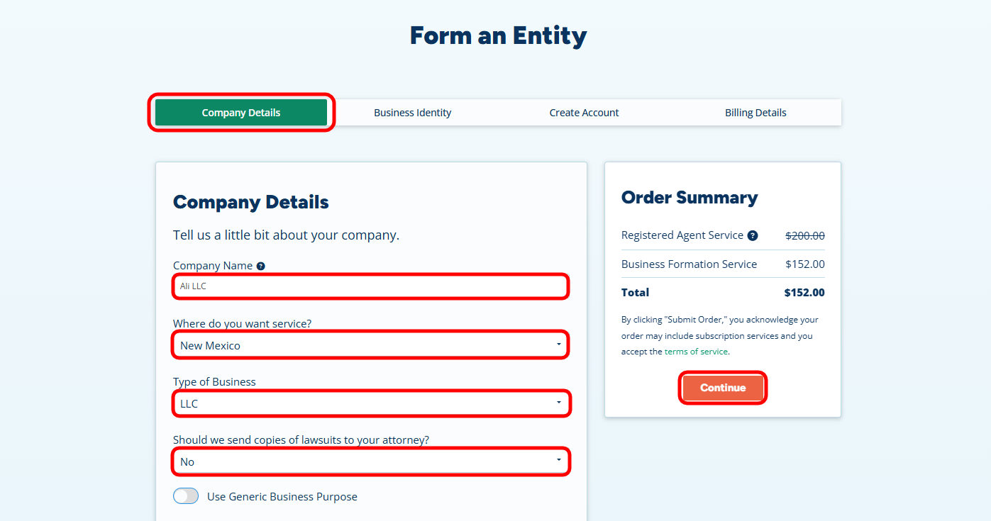 - Company Name: Enter your desired business name. For this guide, let’s use “Ali LLC” as our example.
