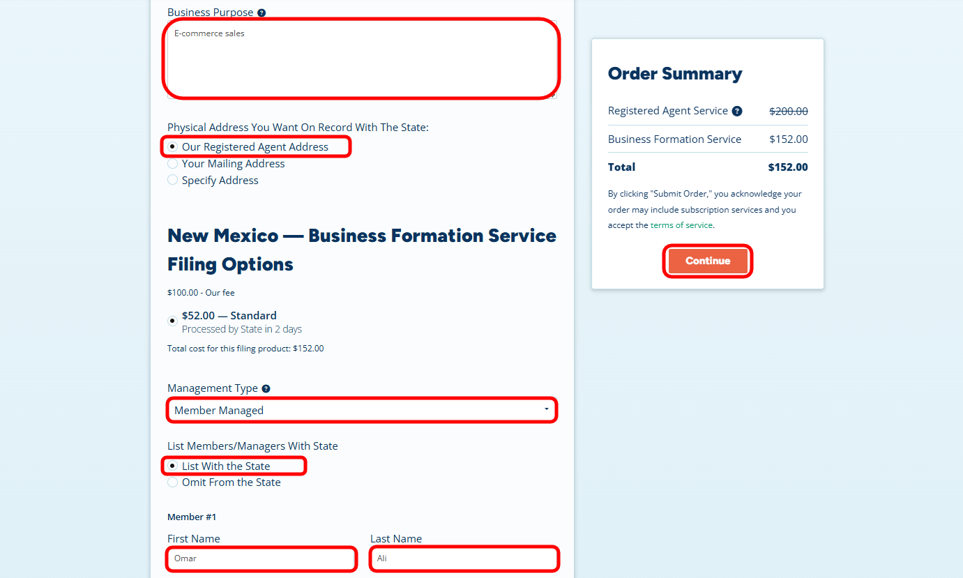 Crucial for Privacy: At the Physical Address field, select ‘Our Registered Agent Address.’ Even if you live in the US, I highly recommend this. It keeps your personal home address off the public internet. Of course, if you actually have an address or office in New Mexico you can select ‘Your Mailing Address,’ but most people should choose the Registered Agent address for privacy. - Management Type: Choose Member-Managed (this means you, the owner, run the day-to-day operations).