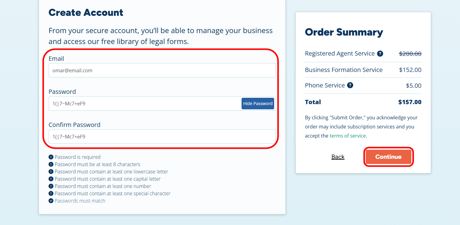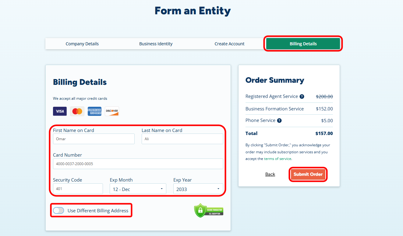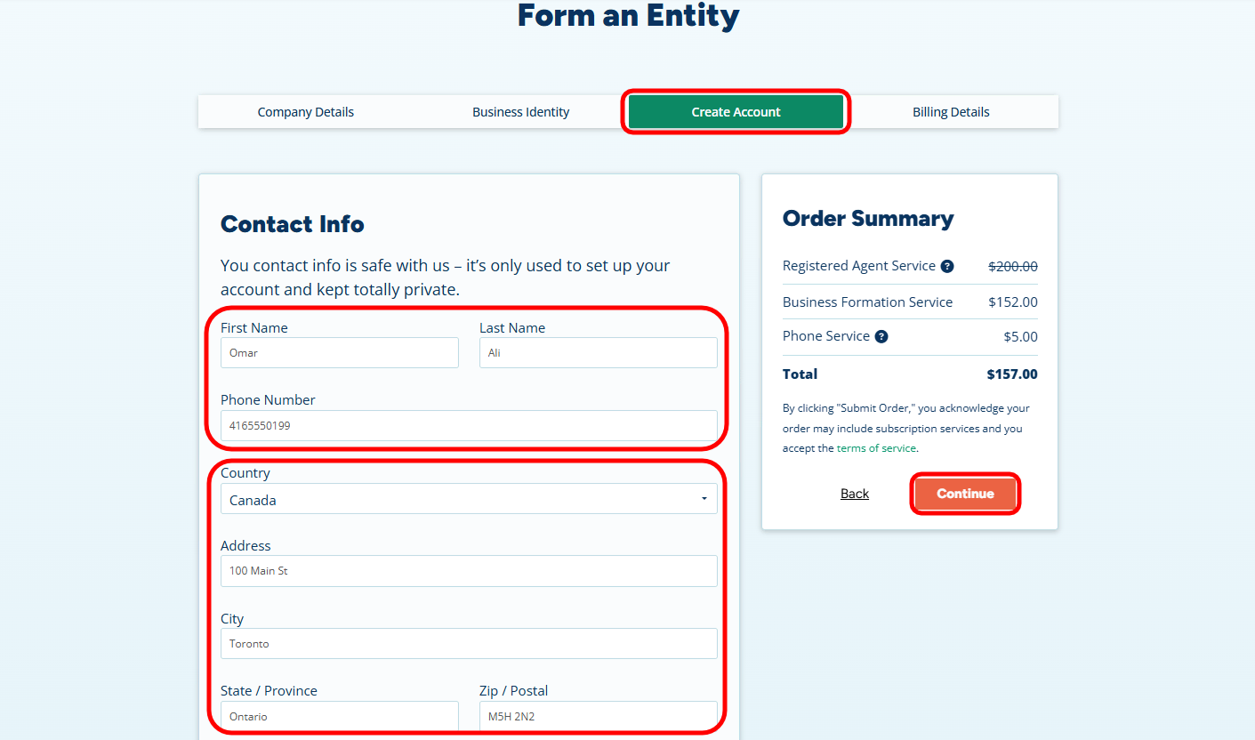 - Contact Info: Enter your name and residential address exactly as they appear on your official ID. This is for the Registered Agent’s internal billing only and is not made public.